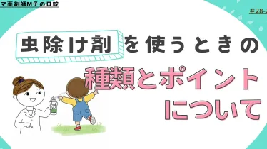 こんにちは!ママ薬剤師のM子です。今回は、虫除けの種類や利用時のポイントについて解説していきます!M子先生前回は、虫除け剤について、よく使われる医薬品成分と天然成分についてお伝えしました。その時に、ディートやイカリジンの使用可能年齢やポイン...