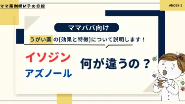 こんにちは。ママ薬剤師M子です。今回は、うがい薬の効果とその特徴についてお伝えしていきたいと思います。特に、うがい薬の「イソジン」は有名ですが、実は「アズノール」という名前のうがい薬もあることをご存知でしょうか。悩むM子色だけで伝えると、「...